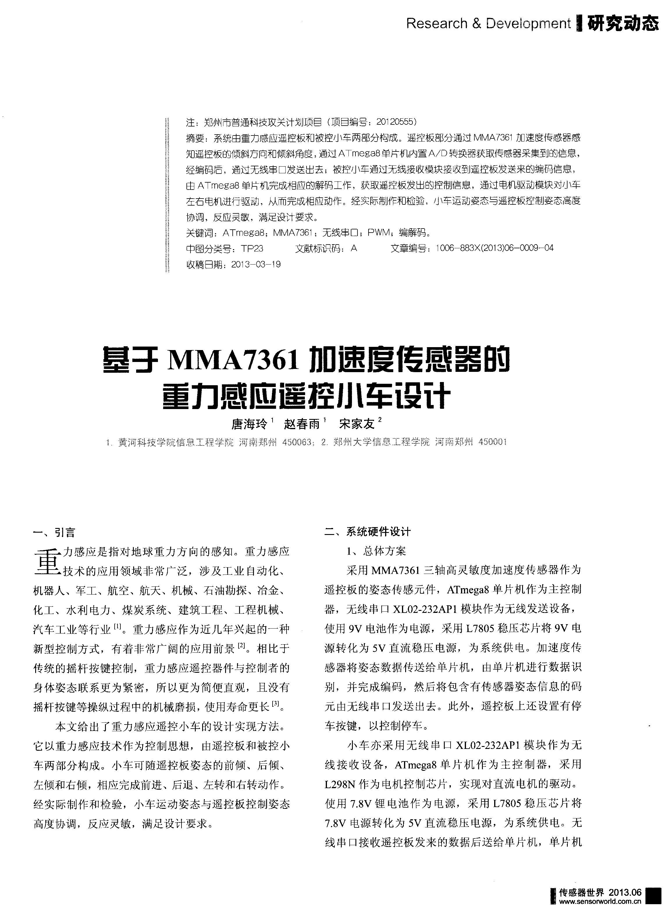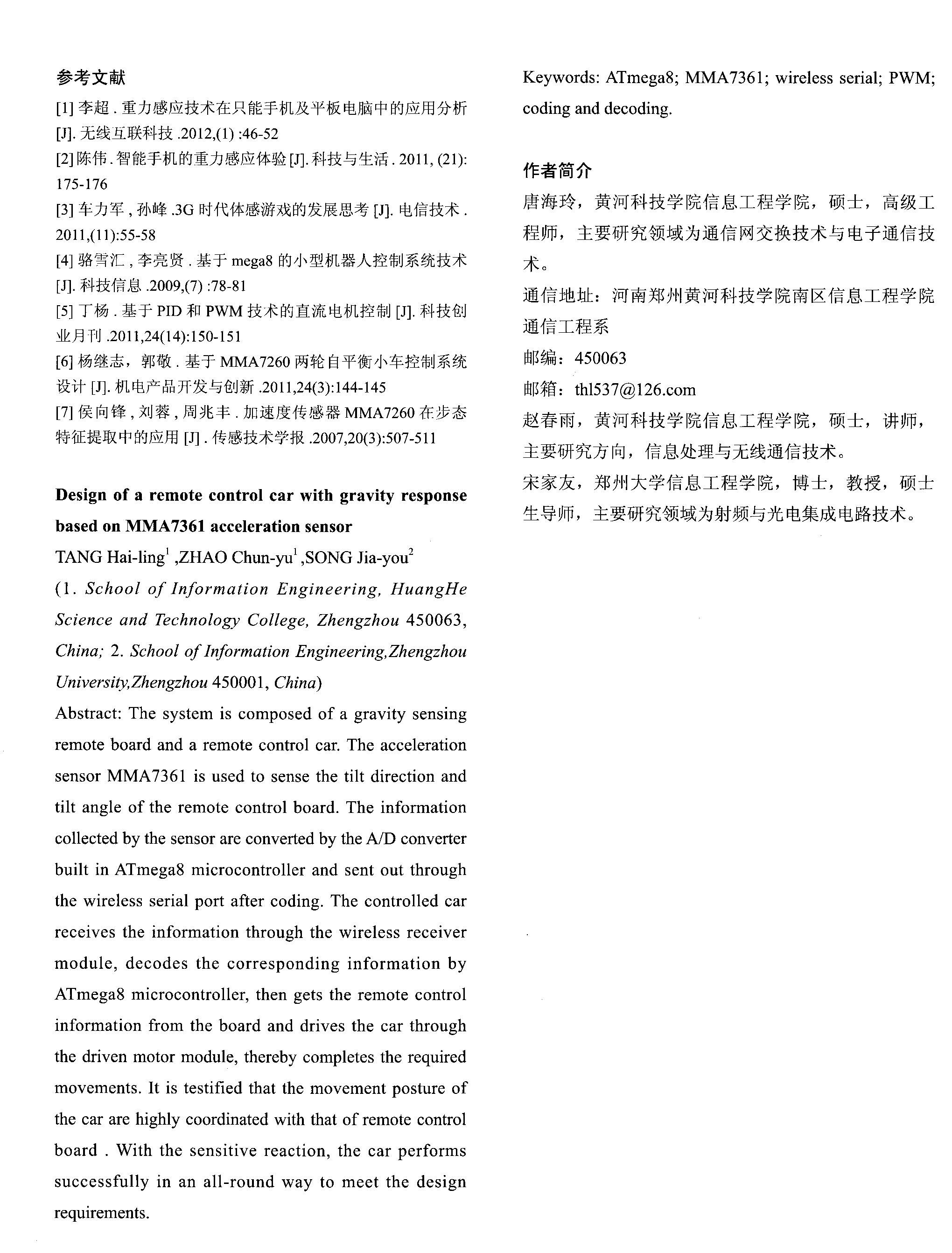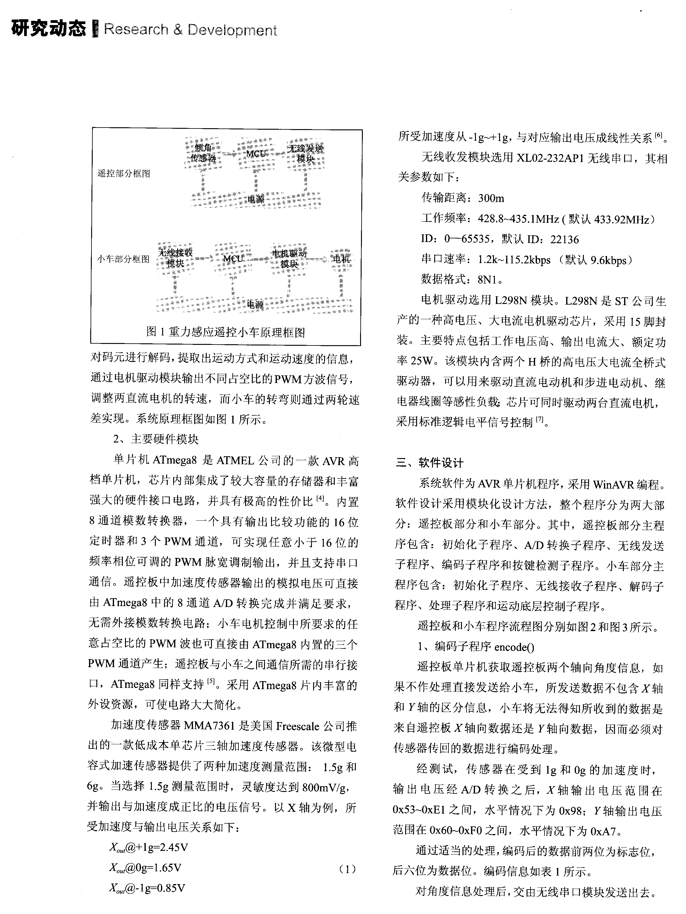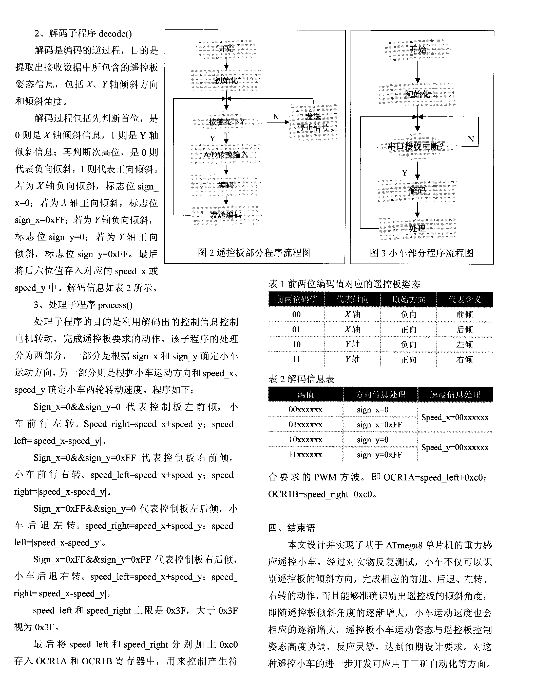 以下是引用片段: 一、引言 力感應是指對地球重力方向的感知。重力感應 技術的應用領域非常廣泛,涉及工業自動化、 機器人、軍工、航空、航天、機械、石油勘探、冶金、 化工、水利電力、煤炭系統、建筑工程、工程機械、 汽車工業等行業⑴。重力感應作為近幾年興起的一種 新型控制方式,有著非常廣闊的應用前景[2]。相比于 傳統的搖桿按鍵控制,重力感應遙控器件與控制者的 身體姿態聯系更為緊密,所以更為簡便直觀,且沒有 搖桿按鍵等操縱過程中的機械磨損,使用壽命更長m。 本文給出了重力感應遙控小車的設計實現方法。 它以重力感應技術作為控制思想,由遙控板和被控小 車兩部分構成。小車可隨遙控板姿態的前傾、后傾、 左傾和右傾,相應完成前進、后退、左轉和右轉動作。 經實際制作和檢驗,小車運動姿態與遙控板控制姿態 高度協調,反應靈敏,滿足設計要求。 1、總體方案 采用MMA7361三軸高靈敏度加速度傳感器作為 遙控板的姿態傳感元件,ATnwga8單片機作為主控制 器,無線串口 XL02-2EAP1模塊作為無線發送設備, 使用9V電池作為電源,采用L7805穩壓芯片將9V電 源轉化為5V直流穩壓電源,為系統供電。加速度傳感器將姿態數據傳送給單片機,由單片機進行數據識 別,并完成編碼,然后將包含有傳感器姿態信息的碼 元由無線串口發送出去。此外,遙控板上還設置有停 車按鍵,以控制停車。 小車亦采用無線串口 XL02432AP1模塊作為無 線接收設備,ATmega8單片機作為主控制器,采用 L298N作為電機控制芯片,實現對直流電機的驅動。 使用7.8V鋰電池作為電源,采用L7805穩壓芯片將 7.8V電源轉化為5V直流穩壓電源,為系統供電。無 線串口接收遙控板發來的數據后送給單片機,單片機 |