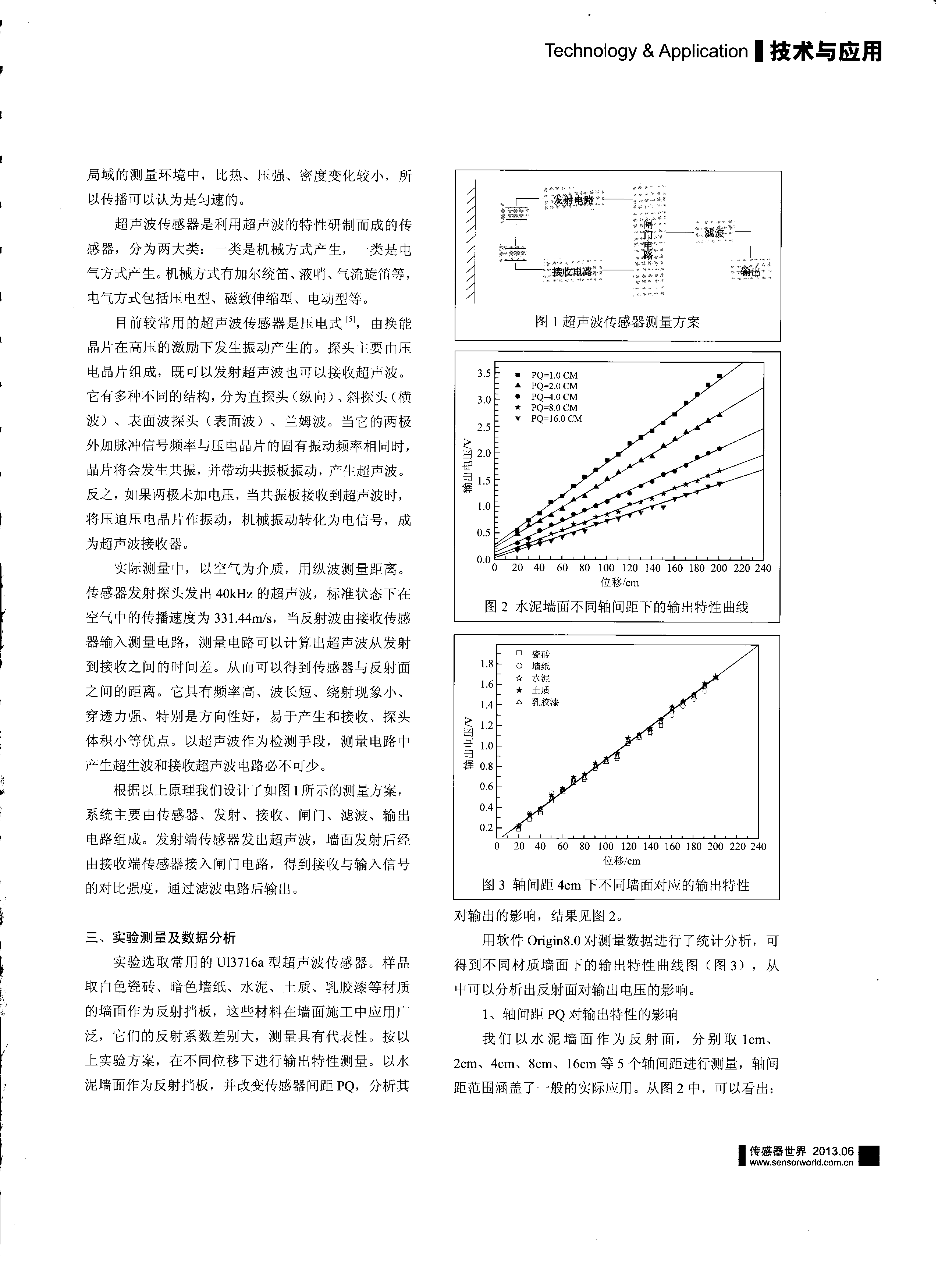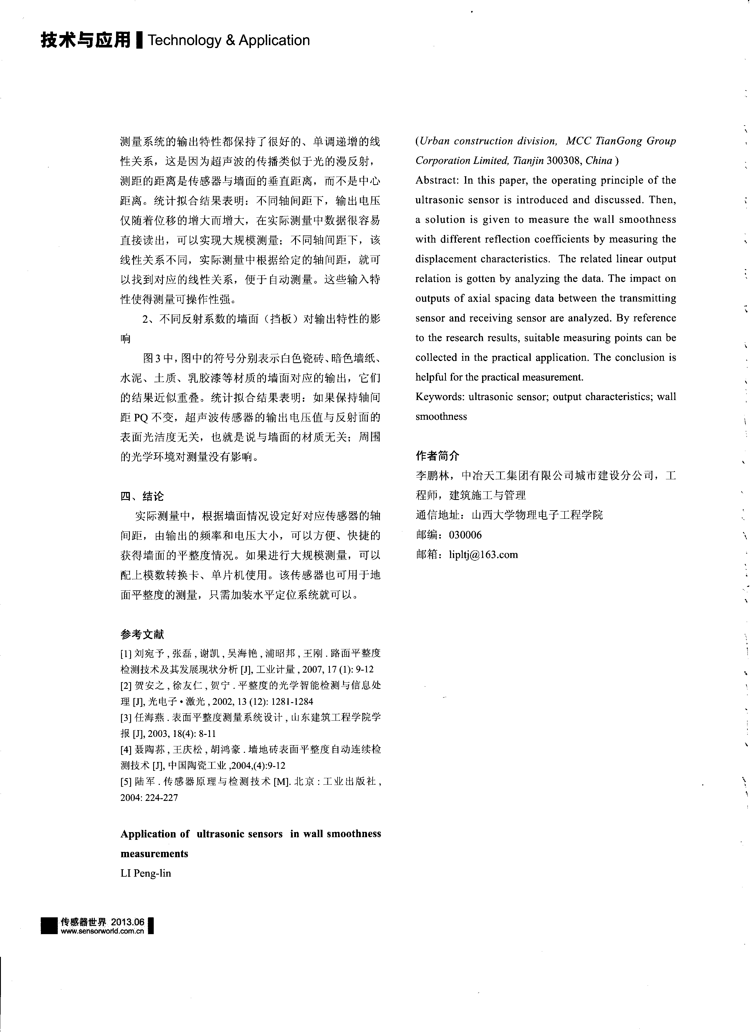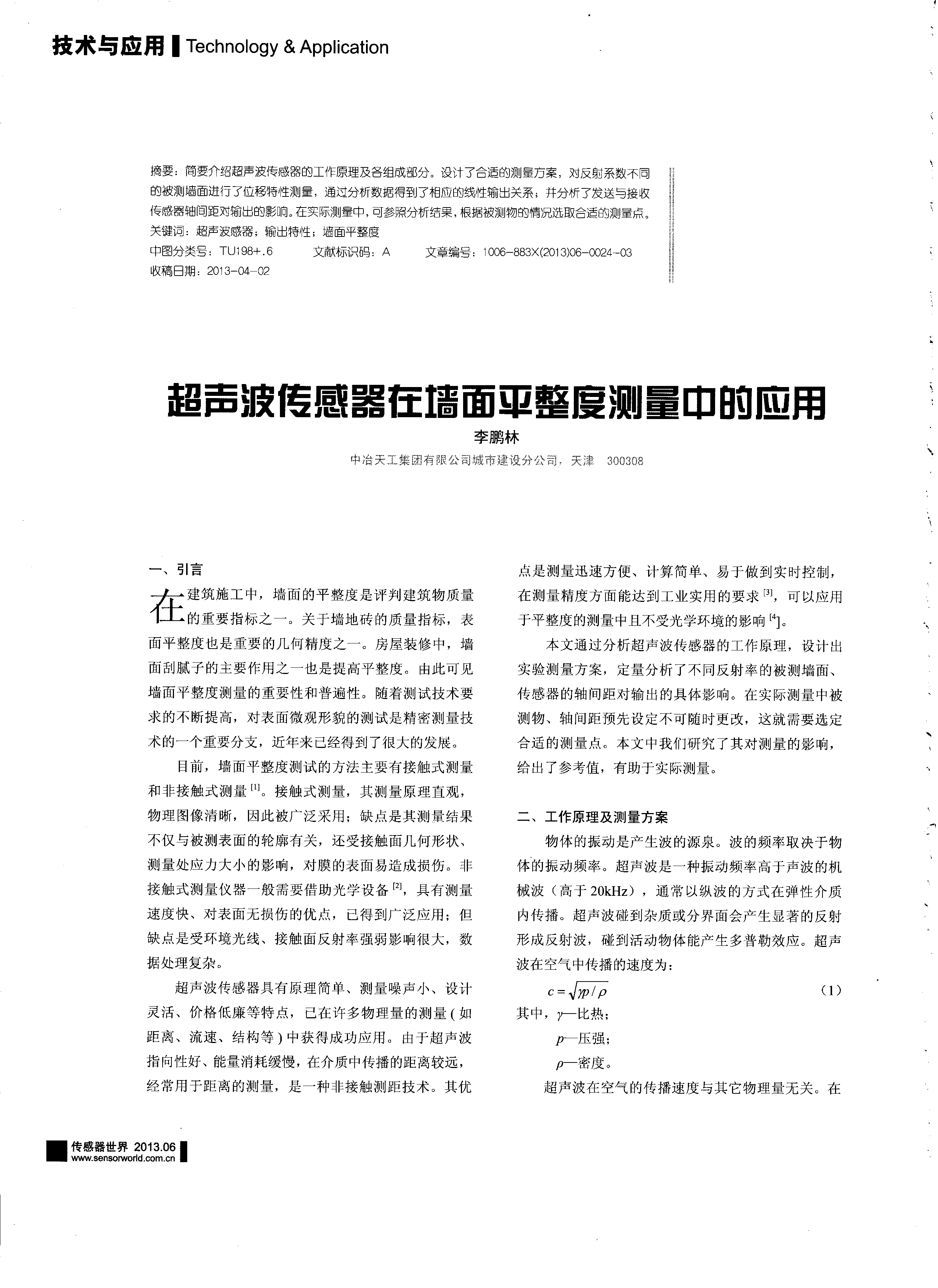 一、引言 在建筑施工中,墻面的平整度是評判建筑物質量的重要指標之一。關于墻地磚的質量指標,表 面平整度也是重要的幾何精度之一。房屋裝修中,墻 面刮膩子的主要作用之一也是提高平整度。由此可見 墻面平整度測量的重要性和普遍性。隨著測試技術要 求的不斷提高,對表面微觀形貌的測試是精密測量技 術的一個重要分支,近年來已經得到了很大的發展。 目前,墻面平整度測試的方法主要有接觸式測量 和非接觸式測量[1]。接觸式測量,其測量原理直觀, 物理圖像清晰,因此被廣泛采用;缺點是其測量結果 不僅與被測表面的輪廓有關,還受接觸面幾何形狀、 測量處應力大小的影響,對膜的表面易造成損傷。非 接觸式測量伩器一般需要借助光學設備[2],具有測量 速度快、對表面無損傷的優點,已得到廣泛應用;但 缺點是受環境光線、接觸面反射率強弱影響很大,數 據處理復雜。 超聲波傳感器具有原理簡單、測量噪聲小、設計 靈活、價格低廉等特點,已在許多物理量的測量(如 距離、流速、結構等)中獲得成功應用。由于超聲波 指向性好、能量消耗緩慢,在介質中傳播的距離較遠, 經常用于距離的測量,是一種非接觸測距技術。其優 點是測量迅速方便、計算簡單、易于做到實時控制, 在測量精度方面能達到工業實用的要求[3],可以應用 于平整度的測量中且不受光學環境的影響[1。 本文通過分析超聲波傳感器的工作原理,設計出 實驗測量方案,定量分析了不同反射率的被測墻面、 傳感器的軸間距對輸出的具體影響。在實際測量中被 測物、軸間距預先設定不可隨時更改,這就需要選定 合適的測量點。本文中我們研究了其對測量的影響, 給出了參考值,有助于實際測量。 二、工作原理及測量方案 物體的振動是產生波的源泉。波的頻率取決于物 體的振動頻率。超聲波是一種振動頻率高于聲波的機 械波(高于20kHz),通常以縱波的方式在彈性介質 內傳播。超聲波碰到雜質或分界面會產生顯著的反射 形成反射波,碰到活動物體能產生多普勒效應。超聲 波在空氣中傳播的速度為: |