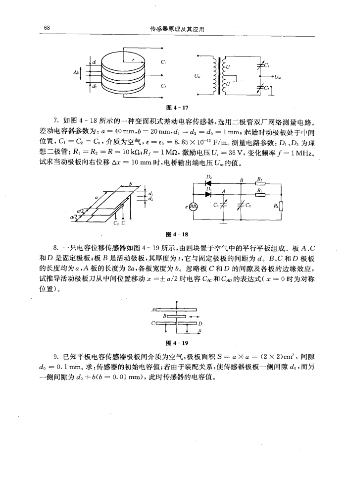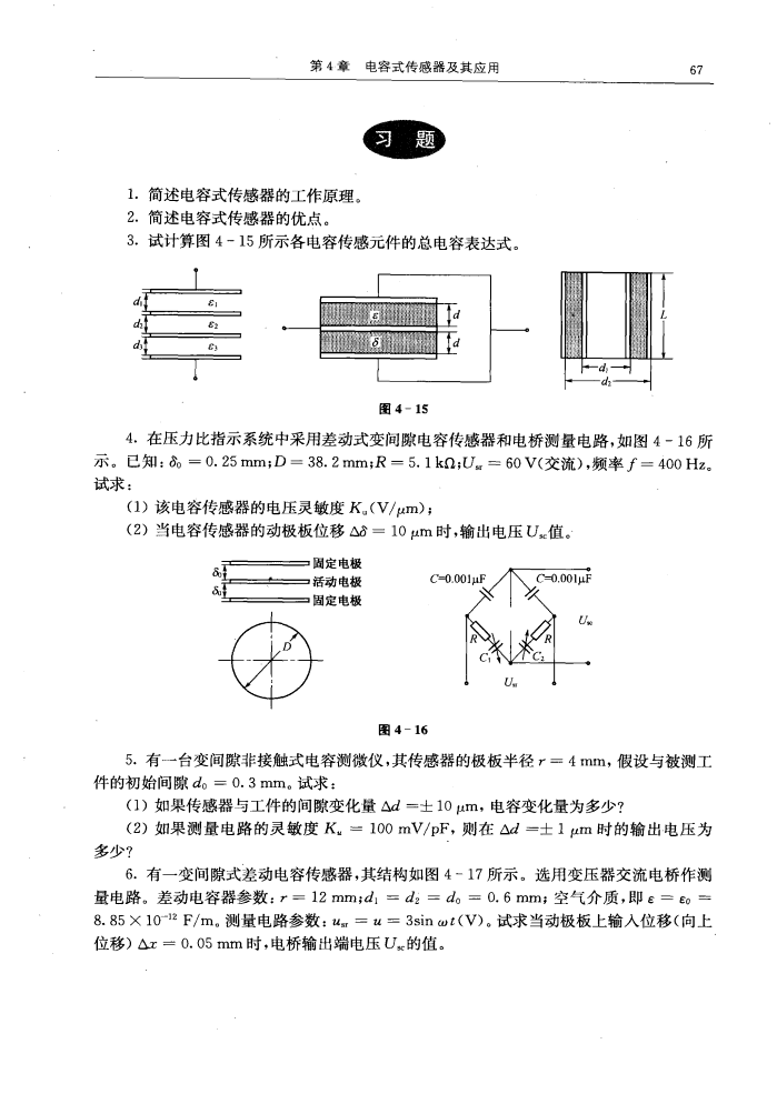 文摘: 圖4-14是電容式差壓傳感器結(jié)構(gòu)示意圖。這種傳感器結(jié)構(gòu)簡單、靈敏度 高、響應(yīng)速度快(約100ms)、能測微小壓差(0?0.75 Pa)。它是由兩個 玻璃圓盤和一個金厲(不銹鋼)膜片組成。兩玻璃圓盤上的凹面深約25 mm,其上鍍金屬以作為電容式 傳感器的兩個固定極板,而夾在兩凹圓 盤中的膜片則為傳感器的可動電極,則形成傳感器的兩個差動電容C1、 C2。當兩邊壓力p1、p2相等時。膜片處在中間位置與左、右固定電容間距 相等,因此兩個電容相等…… |