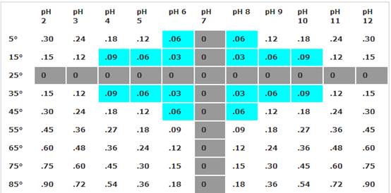 注意: 淺藍(lán)色數(shù)值的誤差小于0.1 ,可能不需要溫度補(bǔ)償。灰色數(shù)值是溫度和pH值,沒有溫度導(dǎo)致的pH值誤差。