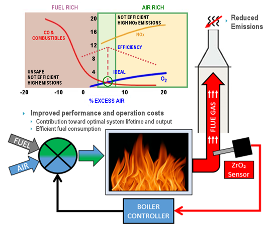完全燃燒需要正確的燃料和氧氣比。這個比率,可以通過在一個閉環(huán)反饋系統(tǒng)中使用氧傳感器測量排氣/煙道氣中的氧濃度來調(diào)節(jié)輸入結(jié)構(gòu)的控制器來優(yōu)化和維持。當(dāng)供應(yīng)的燃料的品種是各種各樣的時候這個就顯得特別有用(即來自不同源頭的氣體)。