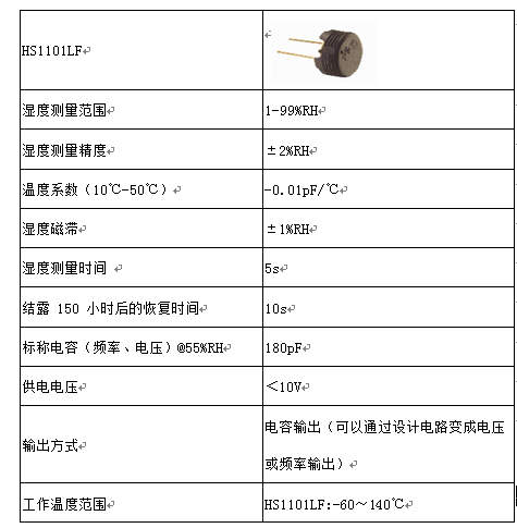 濕度對打印機有如此大的影響,那打印機內部必須對濕度值有一個監控和管理。首先是紙張方面,大多數紙質包裝材料都含有防潮材料,所以將紙張存放在包裝紙中直至需要打印才拆開,這對保護紙張有很大作用。通常打印機內部都會使用濕度模塊來測量打印機內部空氣相對濕度,如果濕度超過了小于20%RH,或者大于60%RH,那么在打印機內部加裝的加濕器和除濕器就要工作起來了。推薦使用高分子濕敏電容HS1101LF制成濕度測量模塊來測量打印機的空氣相對濕度,下面是HS1101LF的參數