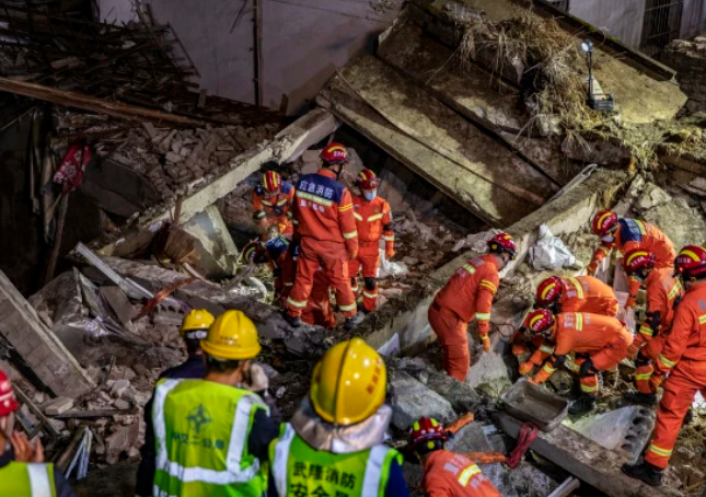 參與救援的消防指戰員告訴記者,他們趕到現場時看到食堂所在的一棟二層高小樓已被夷為平地,磚塊、預制板、房梁等散落一地?!疤课菔褂玫氖巧炒u,建造年代較為久遠,整體強度相對較弱。”