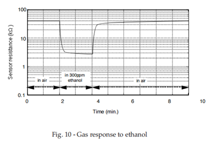 首先我們看看傳感器對待測氣體的響應速度,畢竟傳感器對污染氣體響應不及時的話可能會使人們處于危險之中,所以一定要及時發現隱患。以300ppm濃度的乙醇氣體做測試,可見TGS2620對乙醇氣體響應速度是十分快速的。參考下圖的典型值。