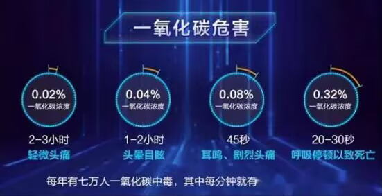一氧化碳是無色,無臭,無味,但吸入對人體有十分大的傷害。它會結合血紅蛋白生成碳氧血紅蛋白導致人缺氧。最常見的一氧化碳中毒癥狀,如頭痛,惡心,嘔吐,頭暈,疲勞和虛弱的感覺,暴露在一氧化碳中可能嚴重損害心臟和中樞神經系統,會有后遺癥。根據測試,空氣中的一氧化碳濃度達到50ppm時,健康成年人可以承受8小時;達到200ppm時,健康成年人2~3小時后,輕微頭痛、乏力;達到400ppm時,健康成年人1~2小時內前額痛,3小時后威脅生命;到800ppm時,健康成年人45分鐘內,眼花、惡心、痙攣,2小時內失去知覺,2~3小時內死亡。