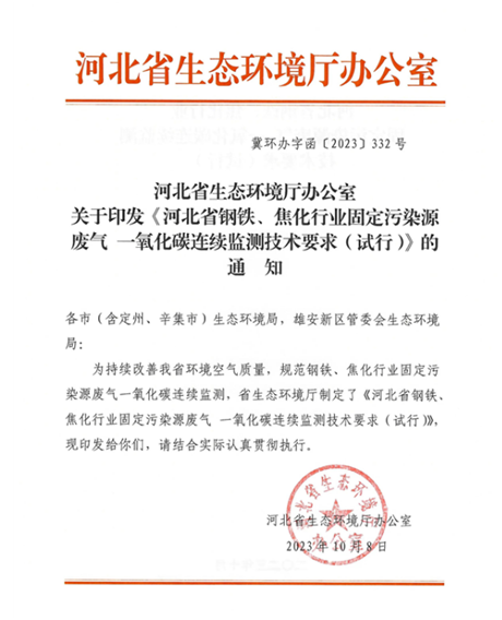 一氧化碳?xì)怏w是人們常見易燃?xì)怏w,在日常生活中,碳燃燒,煤炭燃燒,天然氣等都會(huì)產(chǎn)生一氧化碳,雖然一氧化碳是常見的氣體,但是并不是對人體有利的氣體,相反在濃度高的時(shí)候可能還會(huì)對人體的機(jī)能產(chǎn)生損壞,更甚至威脅生命健康。工業(yè)上對于一氧化碳的排放也有要求。2023年10月為持續(xù)改善環(huán)境空氣質(zhì)量,規(guī)范鋼鐵、焦化行業(yè)固定污染源廢氣一氧化碳連續(xù)監(jiān)測,河北省生態(tài)環(huán)境廳制定了《河北省鋼鐵、焦化行業(yè)固定污染源廢氣 一氧化碳連續(xù)監(jiān)測技術(shù)要求(試行)》,文件全文如下: