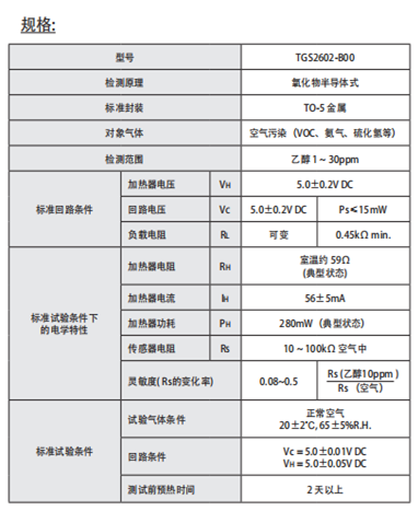 二、TGS2602(空氣質量傳感器)具體規格: