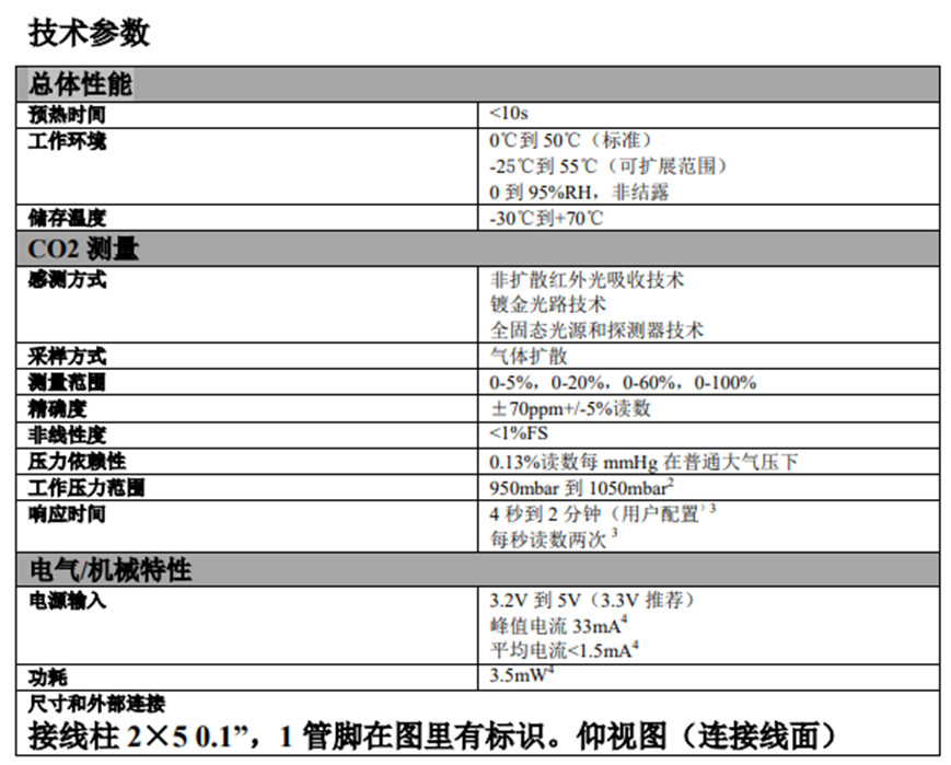 除了最基本的CO2濃度數字輸出外,該傳感器還可定制包含溫濕度輸出的數據,以及模擬電壓輸出0.5-4V。