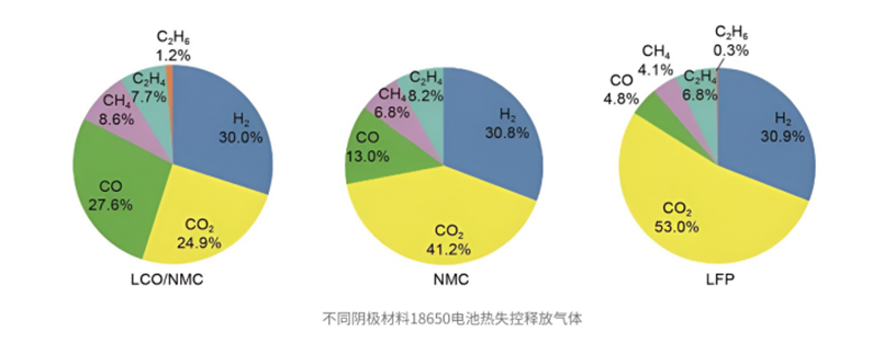 鋰電池熱失控時會放出大量氣體,不同種類的含鋰陰極材料熱失控時釋放的氣體很相似,最主要的氣體有H2、CO、CO2、CH4等。