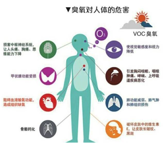 臭氧能到達呼吸道的深部,對呼吸器官有強烈的刺激作用,引起呼吸道的收縮。其刺激的程度勝于氮氧化物與二氧化硫,其對呼吸系統的毒性比氮氧化物大10倍以上。臭氧的嗅覺閾值很低,濃度達到0.02 ppm時,就能聞到臭味;達到0.1ppm時,呼吸2小時,將使肺活量減小20%,達到0.3ppm,對鼻、腦有刺激作用;超過1ppm時,眼、鼻、喉嚨發干,有燒灼感,頭痛,時間再長,中樞神經會發生障礙,思維還會紊亂;達到10ppm時,容易引起肺氣腫。此外,臭氧還能阻礙血液輸氧功能,造成組織缺氧;使甲狀腺功能受損、骨骼鈣化,還可引起潛在性的全身影響,如誘發淋巴細胞染色體畸變,損害某些酶的活性和產生溶血反應。大量實驗研究表明,暴露在臭氧濃度為0.16 mg/m3的空氣環境中,6.6小時,健康人群就會有不良影響的顯著體現;達到0.30 mg/m3時,即可引起咳嗽。我國研究人員的實驗也表明,臭氧濃度達到0.10~0.14 mg/m3時,人體的生理指標就會產生敏感性的變化。世界衛生組織認為,對運動著的敏感者而言,在臭氧濃度為0.20 mg/m3的空氣環境中暴露1至8小時,其呼吸系統會受到顯著性的傷害。患有哮喘病的兒童,屬最敏感人群,臭氧濃度超過一定濃度時,他們的健康受到的影響最大,病情可能導致惡化。世界衛生組織選擇8小時平均0.12 mg/m3作為2000年新修訂的空氣質量健康標準限值。我國制訂的大氣標準則為0.1 mg/m3。