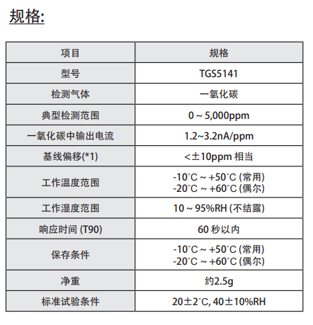 TGS5141是費加羅研發的可電池驅動的電化學式傳感器,使用一個特殊的電極取代了儲水器,由于去除了TGS5042中使用的儲水器,TGS5141與TGS5042相比,其外形尺寸縮減到只有后者的10%大小。超小型的體積使其可以成為諸如便攜式一氧化碳檢測儀、微型住宅一氧化碳檢測儀、多用途火災檢測儀的理想選擇。