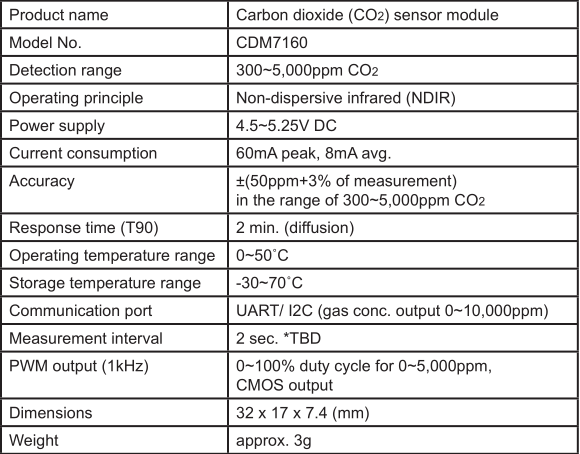 The CDM7160 CO2 module uses a compact NDIR CO2 Sensor, featuring excellent performance characteristics, including high accuracy and low power consumption. Two detector elements inside the module make absolute measurement possible.