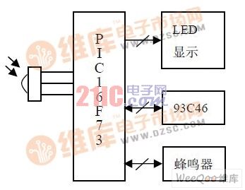 紅外發(fā)射部分電路框圖如圖1所示,主要由單片機PIC16F73及外部電路構成。PIC16F73 單片機是由美國Microchip公司生產(chǎn)的8位單片機,采用Harvard結構,這種結構使指令執(zhí)行和取指操作可重疊進行,從而達到很高的執(zhí)行速度。它只有35條單字節(jié)指令,除了跳轉指令是2周期指令外,其它指令都是單周期指令。相對于其它的8位單片機節(jié)省了1/2的程序空間,并具有四:1的速度優(yōu)勢。