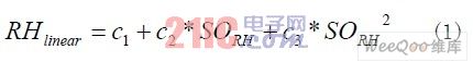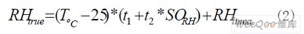 濕度值還和當前溫度值相關,因此還要對其進行溫度補償,補償公式如公式(2)所示,各系數(shù)如表2所示。