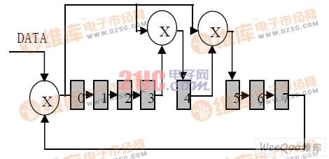 SHT75的CRC值生成算法是根據(jù)SHT75的硬件生成電路來模擬的,硬件生成電路結構如圖四所示: