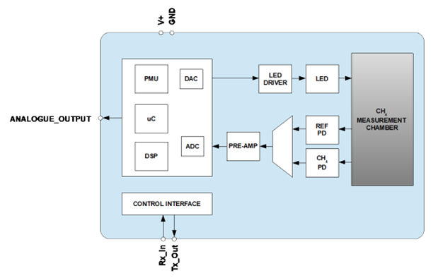 對于氣體傳感解決方案,解決這個問題的方法是開發(fā)一種超低功率甲烷傳感器,適用于電池供電設(shè)備。這是通過兩項前端技術(shù)實現(xiàn)的;超亮發(fā)光二極管(led)和非色散紅外(NDIR)擴散技術(shù)。